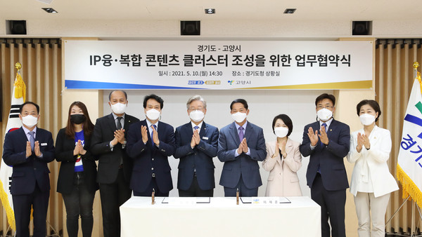 이재준 고양시장과 이재명 경기도지사는 10일 경기도청에서 홍정민·이용우·안민석 국회의원, 김경희 최만식 도의원 등이 참석한 가운데 ‘IP융·복합 콘텐츠 클러스터 조성’을 위한 업무협약서에 공동 서명했다.