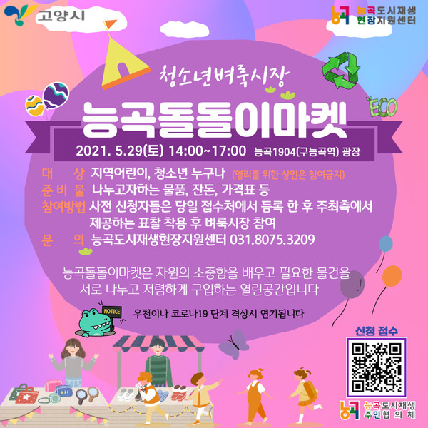 능곡 도시재생사업으로 조성된 ‘토당문화플랫폼’ 능곡1904 야외광장(능곡역)에서 오는 5월 29일(토) 14시부터 17시까지 청소년 벼룩시장이 열린다. 자원의 순환과 공유 경제 가치 확산을 위해 능곡 도시재생 주민협의체가 개최하는 행사로 작년에 이어 올해로 두 번째를 맞이한다. 초등학생부터 고등학생이라면 신청 접수 시 판매자가 될 수 있으며 물건 구매는 누구나 가능하다. 판매자 신청 접수는 30명 내외로 선착순 마감되며, 돗자리를 제공한다. 접수방법은 QR코드, 온라인 접수, 전화 접수 등이며, 자세한 문의는 031-8075-3209로 하면 된다.
