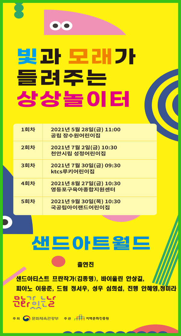 샌드아트월드가 문화체육관광부가 주관하고 지역문화진흥원이 주최하는 2021년 문화가 있는 날 사업인 ‘동동동 문화놀이터’에 선정돼 5월부터 9월까지 매월 마지막 주 수요일 주간에 대면·비대면으로 공연을 진행한다.