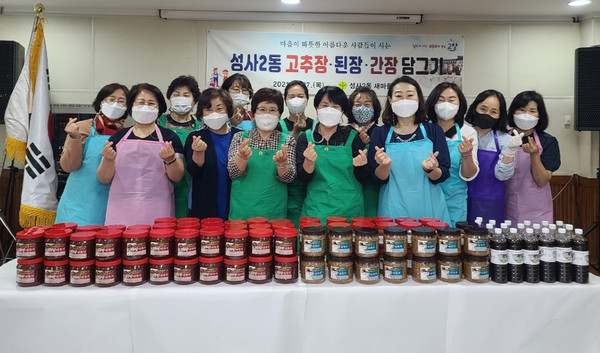 덕양구 성사2동(동장 김윤정)이 지난 27일 ‘이웃사랑 전통 장 담그기’를 가졌다. 성사2동 새마을부녀회(회장 전광자) 주관으로 마련된 이번 장담그기에는 새마을부녀회원과 주민자치위원회 회원 등 15명이 참여했다. 코로나19 방역수칙을 철저히 준수하며 된장과 고추장, 간장을 직접 담가 지역의 소외계층 60세대에 따뜻한 나눔을 실천했다.