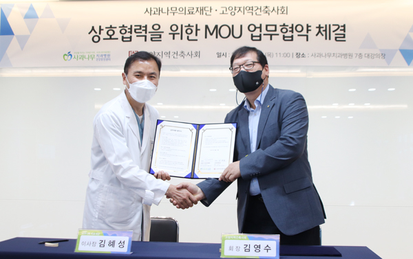 [고양신문] 사과나무의료재단 사과나무치과병원(이사장 김혜성)과 대한건축사협회 고양지역건축사회(회장 김영수)가 27일 상호 유대 관계 형성을 통한 공동의 발전을 기원하는 업무협약(MOU)을 맺었다.