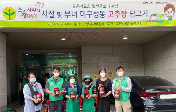 고양시새마을부녀회(회장 양현숙)가 지난 5월 26일(수) 홀몸어르신 평생돌보미 ‘은빛 사랑의 장 나누기’를 추진했다. ‘2021고양시지방보조금 사업’으로 새마을부녀회와 새마을지도자 등이 참석해 직접 고추장을 담갔다. 각 동 새마을부녀회가 주축이 돼 사회복지시설 35곳에 650kg와 부녀회 미구성동의 홀몸어르신과 소외계층 등에 270kg 총 920kg를 전달했다.