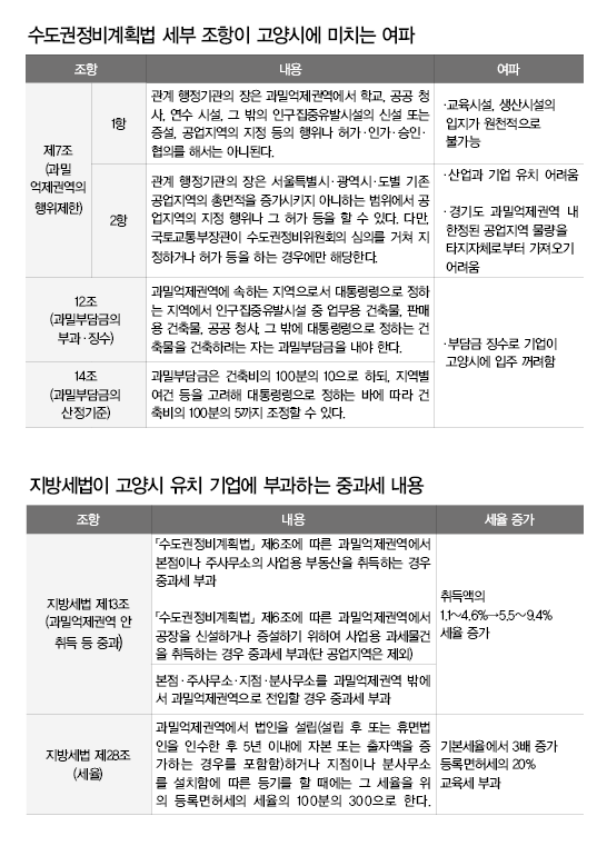 개정된 수정법은 수도권을 과밀억제권역, 성장관리권역, 자연보전권역으로 구분하고 있는데, 고양시는 과밀억제권역에 속하기 때문에 수도권 내에서도 산업을 억제하는 강도가 강한 곳이됐다. 인접한 파주는 산업 입지가 가능한 성장관리권역에 속하지만 고양시는 산업 입지가 원천봉쇄된 것이다.