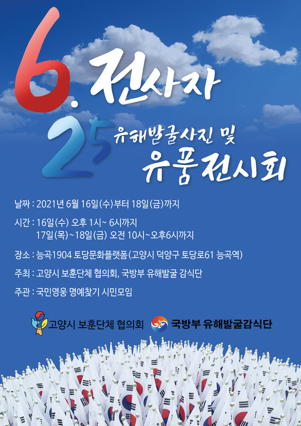 전시는 고양시보훈단체협의회(회장 이묘상)와 국방부 유해발굴감식단이 공동 주최하고, 국민영웅 명예찾기 시민모임(대표 임화섭)의 주관으로 진행된다.