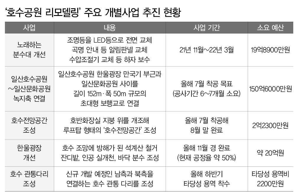 호수공원 개선사업에서 예산확보가 된 개별사업 중에서 올해 하반기부터 가시화되는 사업은 크게 ▲초대형 육교 건설사업 ▲호수 관통다리 건설사업 ▲한울광장 개선사업 ▲노래하는 분수대 개선사업 ▲호수전망공간 조성사업 등 5건이다.