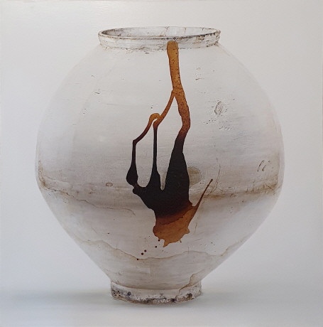“붓으로 빚는 나의 도자기는 내 삶의 모든 것을 담고 있어요. 도자기 그림은 내 마음의 자화상이죠. 도자기에 드러난 선과 균열은 내 삶의 경험이 드러난 손금과 같아요. 캔버스에 한지를 덧붙이고 다시 그 위에 사실적인 형상으로 묘사합니다. 얼핏 보면 이미지가 단순해 보이지만 자세히 들여다보면 도자기를 그렸다가 지우고, 다시 그리기를 반복한 것입니다.”