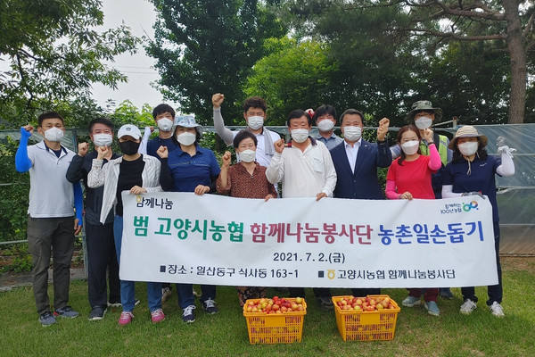 고양시 관내 농협임직원들로 구성된 '고양시농협 함께나눔봉사단'은 7일 2일(금) 일산동구 식사동 자두농가를 찾아 바쁜 일손을 돕고 일손부족으로 어려움을 겪고 있는 농촌 현장의 목소리를 청취했다.