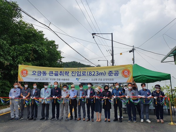 지난달 29일, 오금동 큰골마을회관 앞에서 ‘오금동 큰골취락 진입로 준공식’이 있었다. 행사에는 고양시의회 송규근 시의원과 신도농협 김한모 조합장, 고양누리 새마을금고 김재진 이사장 그리고 2017년 예산을 세울 때 역할을 했던 고부미 전 시의원과 오금동 큰골운영위원회장(위원장 강윤희), 삼송3통 원광현 통장을 비롯한 지역주민 90여 명 참석했다.
