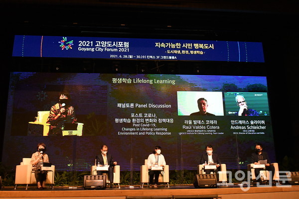 [고양신문] 2019년 유네스코 학습네트워크(UNESCO GNLC) 리더 도시로 선정되는 등 시민참여를 기반으로 한 글로벌 학습도시 추진에 앞장서고 있는 고양시. 평생학습도시 추진에 대한 시의 의지는 이번 2021 고양도시포럼에서도 확인할 수 있었다. 포럼 첫 번째 세션으로 진행된 ‘포스트 코로나, 평생학습 환경의 변화와 정책대응’순서에서는 안드레아스 슐라이허 OECD교육국장, 라울 발데스 코테라 UNESCO평생학습연구소 정책본부장 등 해외연사와 강대중 국가평생교육진흥원장이 각각 발표를 맡아 논의를 진행했다.
