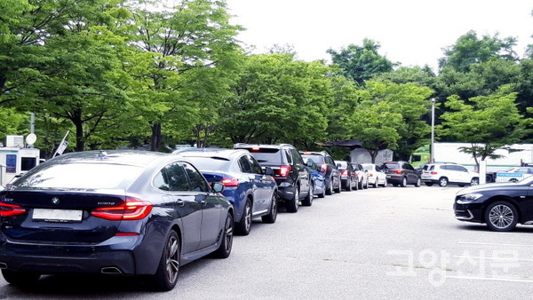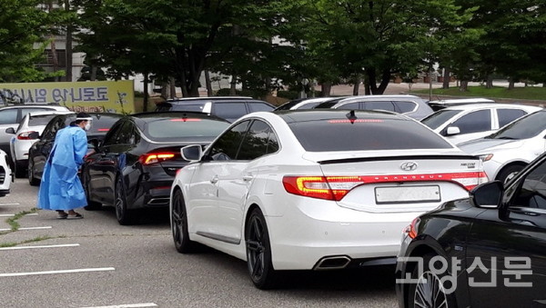 [고양신문] 9일 오전, 고양종합운동장 주차장에 마련된 일산서구 코로나19 임시선별진료소에 차량의 줄이 길게 늘어섰다. 주차요원의 안내에 따라 앞차 꽁무니만 바라보며 넓은 주차장을 두 바퀴 돌아야 순서가 돌아온다.