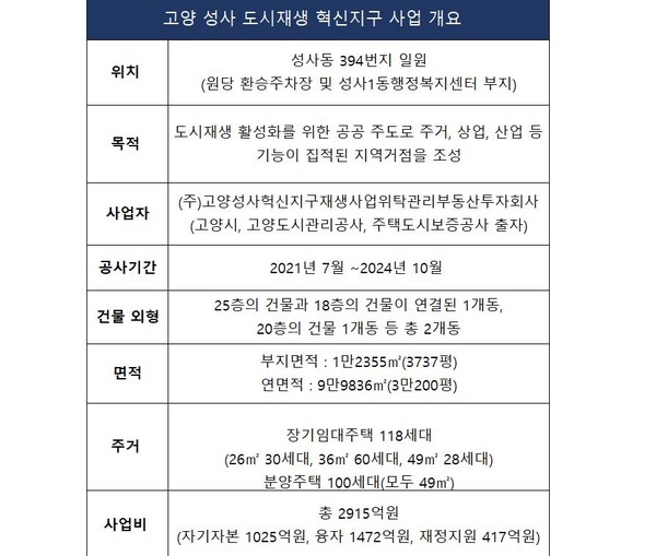 공공주도의 도시재생 리츠(부동산투자신탁) 사업으로 추진되는 성사 혁신지구의 사업비는 총 2915억원이다. 총 사업비의 구성을 보면, 자기자본 1025억원(고양시 502억원, 주택도시보증공사 522억원, 고양도시관리공사 1억원)에다 재정지원 417억원, 융자 1472억원이 포함된다.