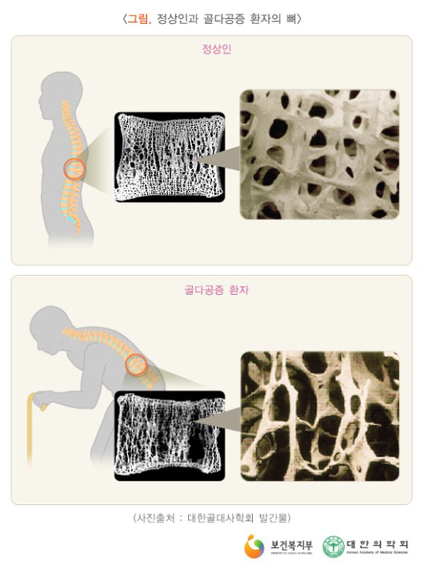 어감 상 ‘뼈에 구멍이 생기는 질환’이라고 보통 인식하고 있지만, 정확하게는 뼈가 약해져서 골조직의 미세구조가 손상되면서 골의 강도가 약화돼 쉽게 부러질 수 있는 상태라고 봐야 한다. 특별한 증상이 없어서 골절이 발생하고 나서야 알게 되는 경우가 많다. 심지어 서서히 진행돼 척추골절이 발생해도 증상이 나타나지 않는 경우까지 있다.