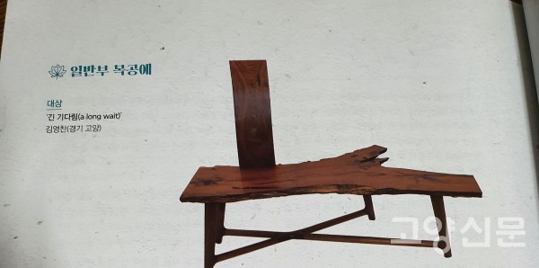 작품은 공모전에서 목공예 부문 대상(농림축산식품부 장관상)으로 300만원의 상금을 받았다. ‘긴 기다림’이라는 제목의 벤치는 “10년 동안 방치됐던 벽조목에 언제나 사람의 체온을 느낄 수 있도록 해주고 싶어 의자라는 옷을 입혀주었다”는 작가의 설명대로 나무 고유의 모양과 색을 살려 용도에 맞게 사용할 수 있도록 디자인됐다.
