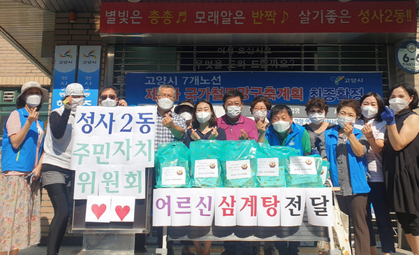 지난 7월 21일 성사2동(동장 김윤정) 주민자치위원회(위원장 박진수)가 중복을 맞아 지역 87세 이상 어르신 173명에게 효(孝)꾸러미(삼계탕)를 전달했다. 코로나19 확산세와 더불어 낮 최고 기온이 36도까지 오르는 무더위 속에서 성사2동 주민자치위원회는 지역 어르신들의 건강을 위해 현관 앞에 삼계탕을 전달했다.