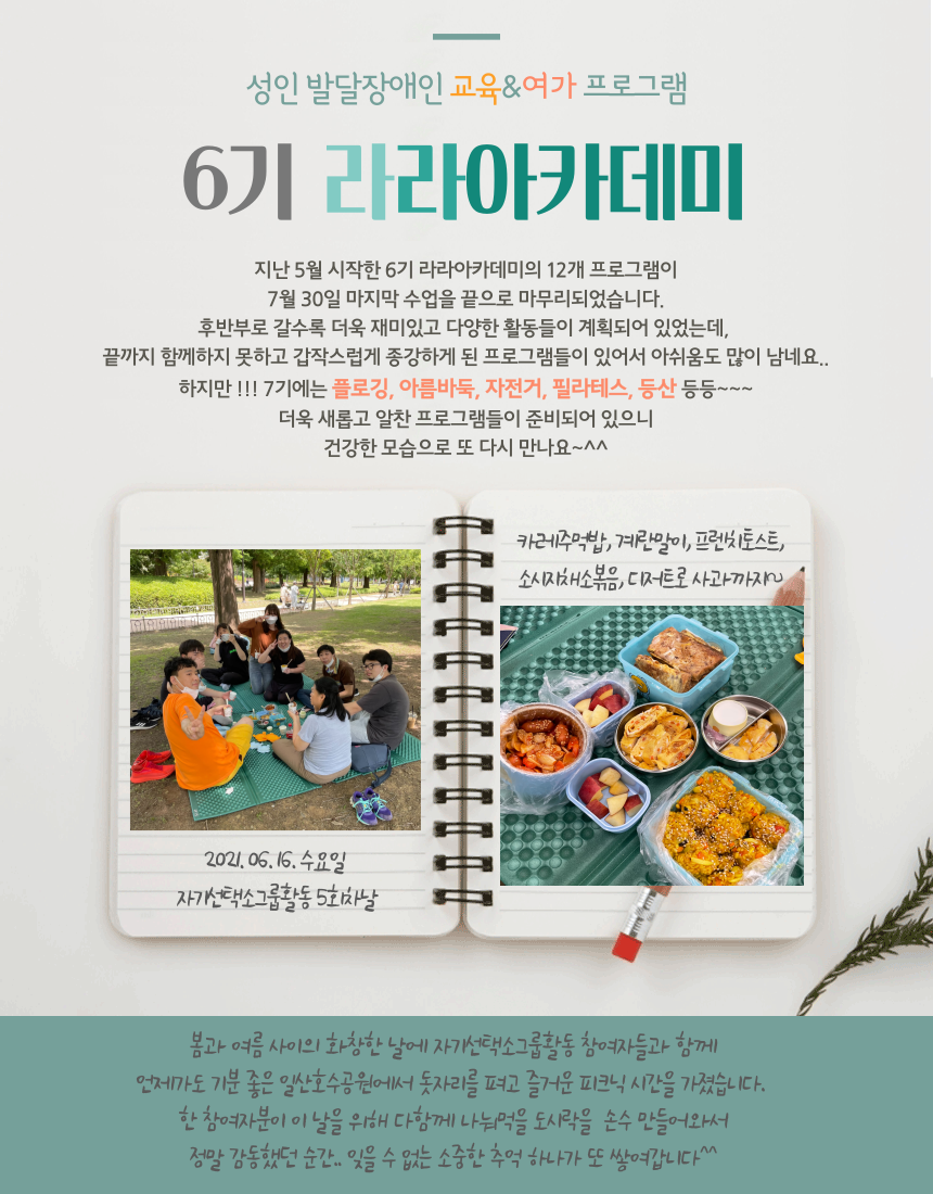 [고양신문] 고양시장애인종합복지관 낮활동지원팀에서 성인 발달장애인을 대상으로 운영하는 교육 및 여가 사업인 ‘라라아카데미’ 6기 과정이 지난 7월 말 마무리됐다.