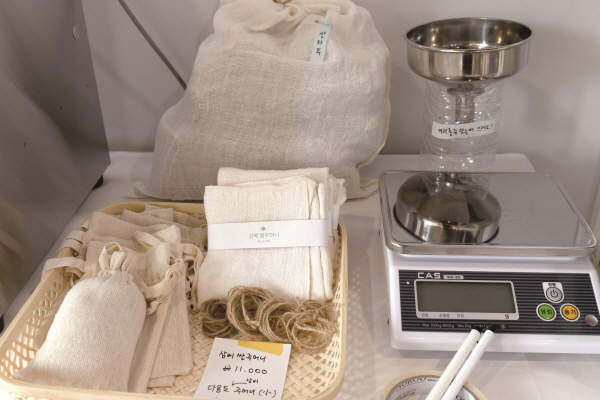 이곳에서는 화장품, 비누, 샴푸, 세제 등 다양한 생활제품을 포장재 없이 판매하고 있다. 플라스틱 제품을 대체하는 대나무 칫솔, 천연수세미, 코코넛화분 등 각종 친환경 제품을 살 수 있으며 집에서 용기를 따로 가져와 각종 천연세제, 곡물류 등을 리필해 갈 수도 있다. 이외에도 생활 속에서 쓰레기를 줄일 수 있는 고체치약, 실리콘 면봉 등 다양한 친환경 아이디어 상품들이 전시되어 있다. 지난달부터는 전국 제로웨이스트 가게들과 함께 우유팩과 멸균팩을 수거해 재활용하는 캠페인도 벌이고 있다. |
