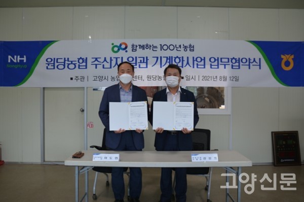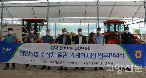 [고양신문] 원당농협(조합장 강효희)과 고양시 농업기술센터(소장 이도연)는 12일 원당동 자재센터(팀장 김재경 상무)에서 ‘주산지 일관기계화사업 업무협약식’을 열었다. 자재센터 내 회의실에서 열린 협약식에는 강효희 조합장, 이도연 소장과 관계자들이 참석했다.