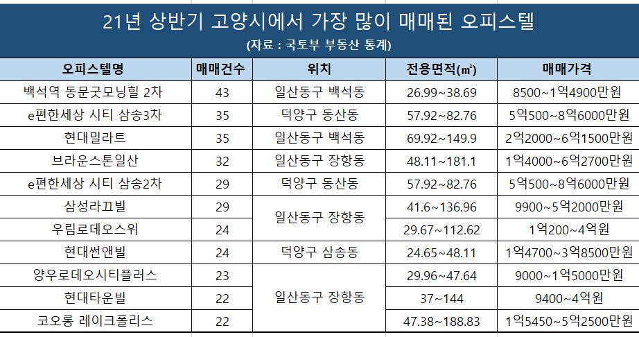 올해 상반기 고양시에서 거래된 오피스텔 중에서 가장 고가로 거래된 것은 대화동의 킨텍스 꿈에그린(84㎡)으로 9억9000만원에 거래됐다. 이어 대화동의 힐스테이트일산(84㎡)이 9억1200만원, 삼송동의 힐스테이트 삼송역이 8억7000만원, 대화동의 한류월드 시티프라디움 레이크(85㎡)가 8억4800만원으로 뒤를 이었다.