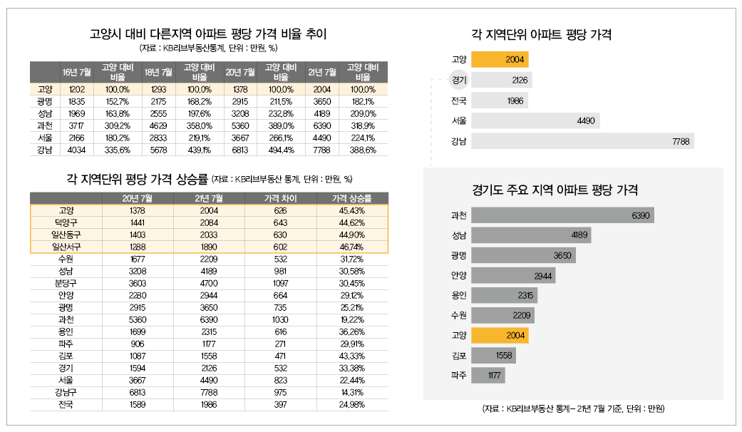 고양시 아파트 가격은 1년 전의 가격과 비교했을 때 평당 626만원(1378만→2004만원) 상승했다. 이에 비해 고양시보다 상승률이 낮았던 지역 중의 상당수는 이보다 더 많이 가격이 상승했다. 대표적으로, 상승률이 29.1%였던 안양은 평당 664만원(2280만→2944만원), 상승률이 25.1%였던 광명은 평당 735만원(2915만→3650만원), 상승률이 30.6%였던 성남은 평당 981만원 (3208만→4189만원) 상승했다.