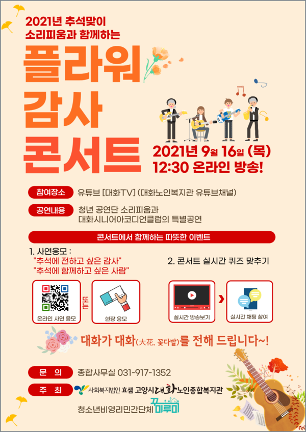 고양시대화노인종합복지관(관장 최윤정)이 9월 민족의 대명절 추석을 맞이해 지역주민과 함께하는 비대면 프로그램을 진행한다. 먼저, ‘플라워 감사 콘서트’를 9월 16일(목) 12:30, 유튜브 ‘대화TV’에서 실시간으로 방송한다. 해당 공연은 청년 공연단 ‘소리피움’ 과 ‘대화시니어아코디언클럽’의 특별공연으로 구성되어 가을에 어울리는 클래식과 트로트, 참여자 대상으로 댓글 이벤트, 사연으로 꽃 배달 등 다양한 깜짝 이벤트도 준비되어 있다. 이를 위해 ‘추석에 전하고 싶은 감사’, ‘추석에 함께하고 싶은 사람’의 사연을 모집하고 있다.