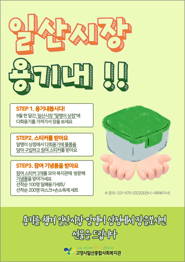 고양시일산종합사회복지관(관장 양성필)이 일산전통시장(회장 박해균)과 함께 오는 9월 1일(수)부터 30일(목)까지 한 달간 일산시장 내 알맹이 상점에서 ‘일산시장 용기내’ 캠페인을 진행한다. ‘일산시장 용기내’는 일산전통시장을 찾는 고객들이 음식 등 물품을 구입 할 때 일회용품(비닐봉지, 일회용 플라스틱 및 스티로폼 용기 등)을 사용하지 않고, 고객이 직접 가져간 다회용기에 담아오는 실천 운동이다.