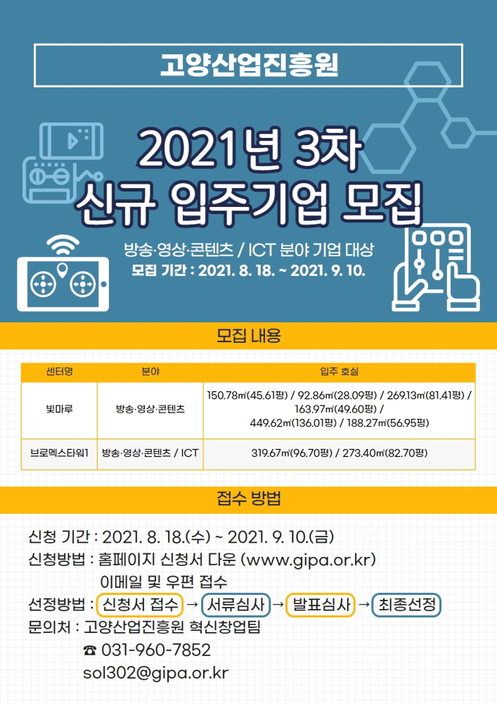[고양신문] 고양산업진흥원(원장 오창희)은 방송·영상·콘텐츠, ICT 등 첨단산업 분야의 기업 육성을 목적으로 기업입주시설 신규 기업을 9월 10일까지 모집한다고 밝혔다.