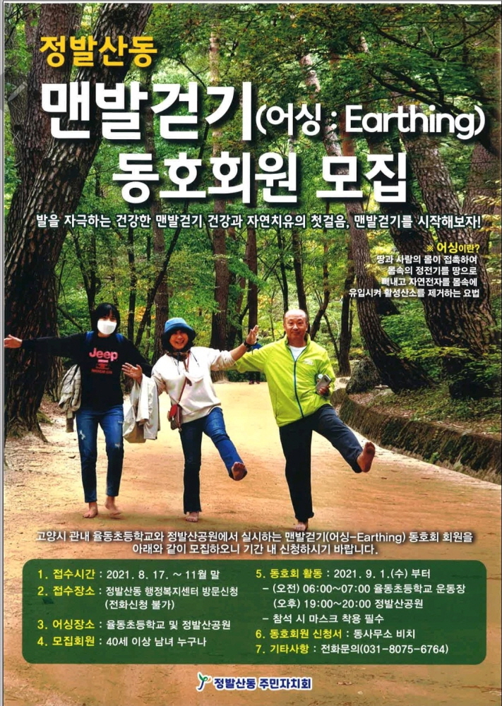 [고양신문] 일산동구 정발산동 주민자치회(회장 진윤숙)가 지역 주민의 건강 증진을 위한 '어싱 동호회' 회원모집을 시작한다.