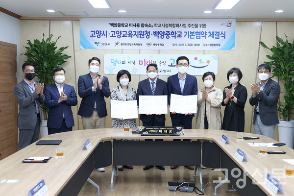 고양시와 고양교육지원청, 백양중학교는 3일 현재 미사용 중인 백양중 합숙소 활용을 위한 ‘학교시설복합화 사업 추진 기본협약’을 체결했다. 이날 협약식에는 2018년부터 백양중학교 합숙소 복합화 사업 추진에 참여한 신정현 도의원과 김효금 시의원(이상 더불어민주당), 박소정 시의원(정의당)을 비롯해 관계자들이 참석했다.