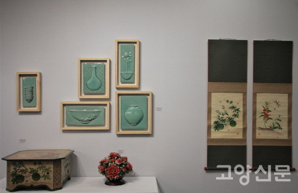 입구에 진열된 손숙지 작가의 ‘풍요’는 수확의 풍성함을 선사한다. 맞은편에 걸린 강경숙 작가의 ‘묵호에서’는 평화로운 묵호 풍경을 보여준다. 백경원 작가의 신작 ‘베수비오화산, 나폴리’를 비롯해 강재순 작가의 ‘삶’, 박영귀 작가의 ‘숲의 문’ 등 각기 다른 화가들의 특징이 묻어나는 작품이 양쪽 벽면에 도열해 있다. 안쪽 별도의 공간은 박수현 작가의 도자공예 ‘시절도래 : 도(陶)’, 이민신 작가의 꽃도자기 ‘화려’, 양화영 작가의 한지공예 ‘민화팔각상’ 같은 한국적인 것으로 꾸몄다.