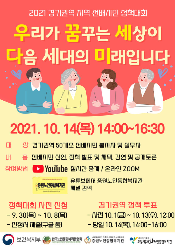 노인인식 제고와 공감대 형성을 위해 경기지역 노인들이 문제를 직접 논의하고 대안을 살피는 ‘2021년 경기지역 선배시민 정책대회’가 오는 10월 14일(목) 경기권역 선배시민 교육지원센터(고양시대화노인종합복지관·중원노인종합복지관)에서 온·오프라인으로 개최된다.