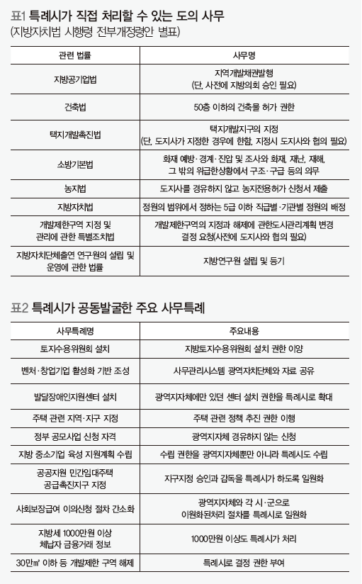 왜냐하면 시행령 개정안에는 기존 법령 안에 있는 사항들을 모아 열거만 했기 때문이다. 시행령 개정안 별표에 인구 100만 이상의 특례시가 직접 처리할 수 있는 도의 사무를 8가지로 명시해 놓기는 했다. 하지만 이는 이미 고양시가 이미 행사하던 권한에서 크게 벗어나지 않는다<표1 참고>.