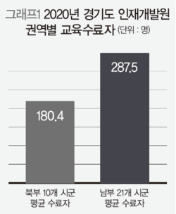 ‘고양시 인재개발원’ 설립 요구는 도내에서는 수원에 유일하게 설치된 지방공무원 교육기관인 경기도인재개발원에 의존할 수밖에 없다는 문제를 해결하기 위해서다. 김대성 팀장은 “경기북부에 있는 공무원들이 서울을 지나 수원으로 교육받으러 가려면 교통 혼잡으로 시간을 많이 빼앗긴다<그래프1 참고>. 그렇다보니 경기북부 공무원들은 경기남부 공무원들에 비해 교육을 받는 횟수가 줄 어들기 마련이다. 고양시에도 인재개발원을 마련해 경기북부 공무원들이 수원까지 갈 필요 없이 가까운 고양에서 교육받을 수 있어야 한다. 결국 교육 기회 확대는 행정서비스 역량강화로 이어진다”고 말했다.