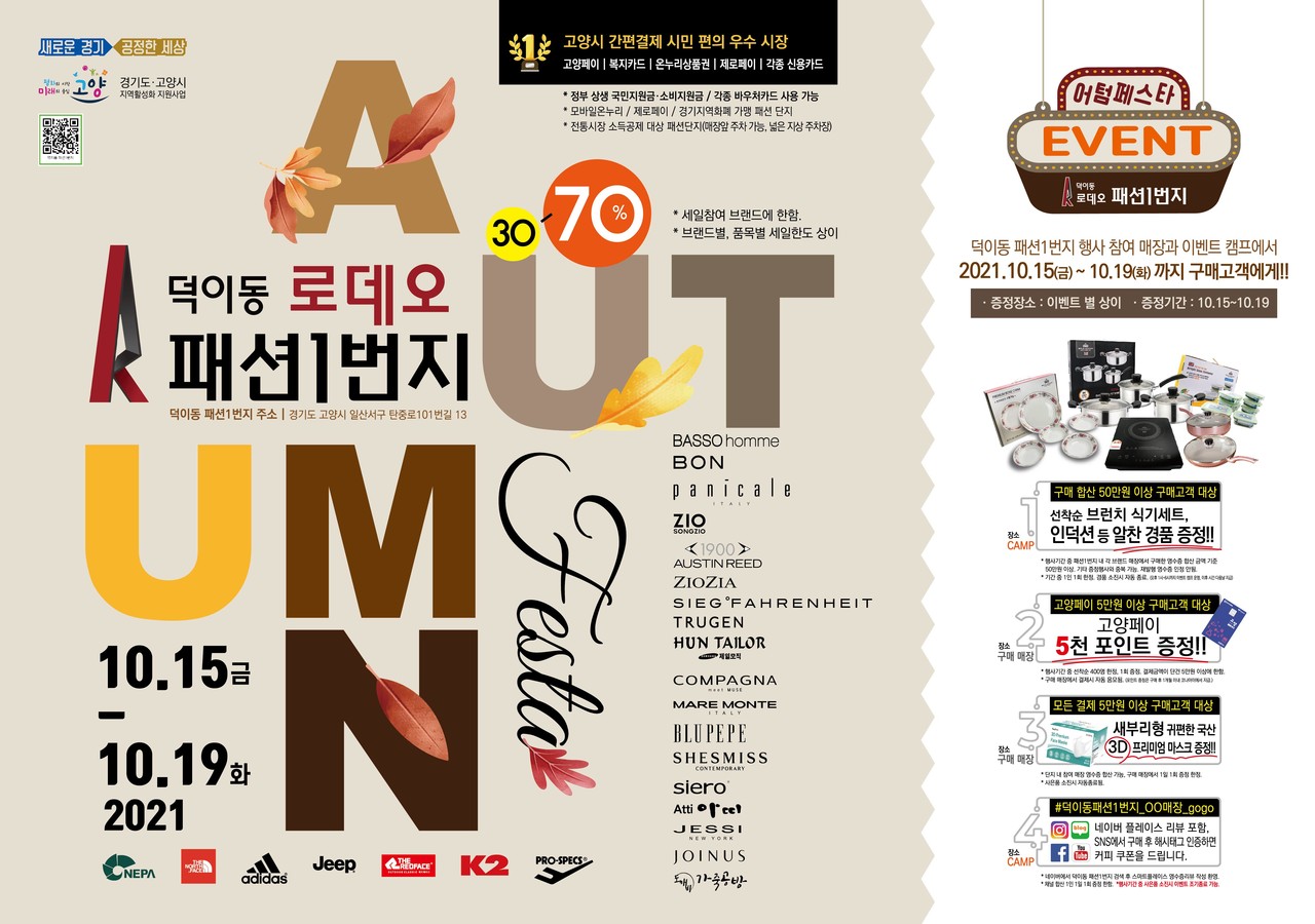 덕이동 로데오거리에서 이달 15일(금)부터 19일(화)까지 가을·겨울 패션 30~70% 할인행사를 펼친다. 덕이동 로데오 패션1번지에서 ‘어텀페스타’라는 이름으로 개최하는 이번 행사는 경기도·고양시가 코로나19로 어려운 소상공인을 위해 일정 지원금을 출연한 ‘코로나19 극복 활성화 지원사업’의 일환으로 이뤄지게 됐다.
