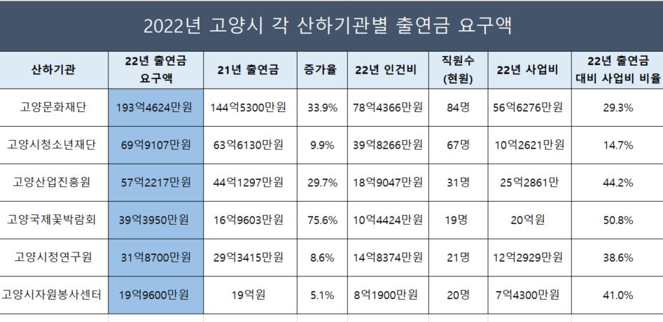 전체 출연금 요구액 대비 인건비 비율이 가장 높은 곳은 고양시청소년재단(57.0%)이고, 그 뒤를 고양시정연구원(46.6%)이고, 고양시자원봉사센터(41%), 고양문화재단(40.5%), 고양산업진흥원(33%), 고양국제꽃박람회(26.5%) 순으로 이었다. 또한 직원수 대비 인건비가 가장 높은 곳은 고양문화재단으로 나타났고, 그 뒤를 고양시정연구원, 고양산업진흥원, 고양청소년재단, 고양국제꽃박람회, 고양자원봉사센터 순으로 뒤를 이었다.