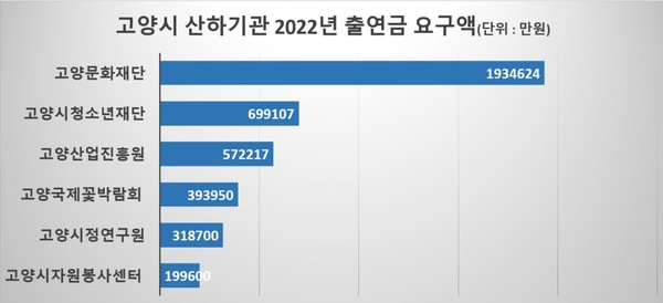 [고양신문] 고양시 각 산하기관이 고양시에 요구하는 내년 출연금이 책정됐다. 고양시가 각 산하기관별로 요구한 2022년 출연금을 보면, 고양문화재단 193억4624만원, 고양시청소년재단 69억9107만원, 고양산업진흥원 57억2217만원, 고양국제꽃박람회 39억3950만원, 고양시정연구원 31억8700만원, 고양시자원봉사센터 19억9600억원 등이다.