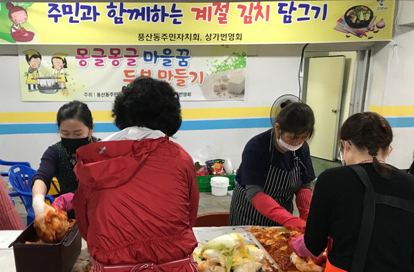 일산동구 풍산동 주민자치회(회장 이석재)가 지난 10월 14일과 15일, 양일에 걸쳐 풍산동 주민자치위원들과 주민협의체, 지역 상인회가 참여해 지역 내 소외된 이웃에게 훈훈한 마음을 전하기 위한 계절 김치를 담갔다. 주민자치회 위원들과 주민협의체 및 지역 상인회의 자발적 참여로 진행된 계절김치 담그기에서는 참여자들이 직접 절이고 담근 김치를 관내 소외 이웃 30가구에 전달했다.