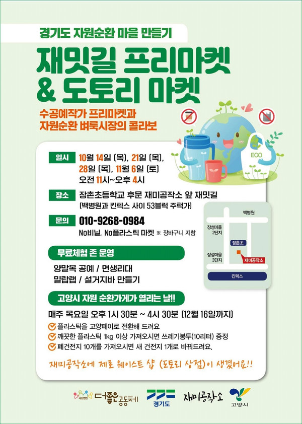 경기도 자원순환 마을 만들기 재밋길 프리마켓&도토리마켓 세 번째, 네 번째 장터가 오는 10월 28일(목)과 11월 6일(토) 일산서구 대화동 장촌초등학교 후문 재미공작소앞 재밋길에서 각각 열린다. 오전 11시부터 오후 4시까지 열리는 이번 장터는 양말목 공예와 면생리대·밀랍랩·설거지바 만들기 등의 무료 체험존이 운영되며, 수공예작가 프리마켓과 자원순환 벼룩시장도 함께 열린다.