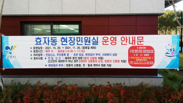 효자동(동장 양재관)이 고양지축 엘에이치8단지 입주민을 위해 아파트 단지 내 현장민원실을 운영하고 있다. 고양지축 엘에이치 8단지는 영구임대와 국민임대 아파트로 4개동 1,382세대, 약 3,679명의 인구 유입이 예상되고 있다. 효자동은 전입신고 등 필수 행정절차를 밟기 위해 행정 수요 급증이 예상돼 10월 29일부터 11월 26일까지 매주 수요일·금요일 14시~17시 현장민원실을 운영한다. 운영 장소는 803동 1층 경로당으로 전입신고와 등·초본발급, 사회복지 상담은 물론, 마을소식과 시정 홍보 등을 병행한다.