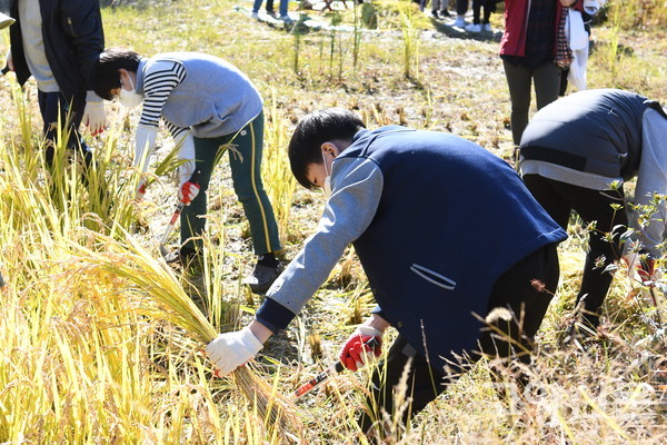 “자 이렇게 일렬로 서서 허리를 굽히고 벼를 베면 되요. 낫질에 다치지 않게 조심하고.”