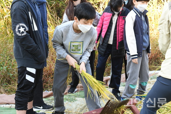 지난 28일 중산동에 위치한 안곡습지 내 묵논학습원. 이른 아침부터 안곡초등학교 6학년 학생 50여명이 모여 벼 베기 활동에 한창이었다. 참가 학생들은 선생님들의 설명에 따라 직접 키운 벼를 수확하고 탈곡도 해보면서 쌀 생산과정을 직접 체험하는 시간을 가졌다. 수업에 참여한 조우현 학생(안곡초 6)은 “직접 모내기 했던 벼들이 이렇게 훌쩍 자라서 직접 수확까지 하는 게 너무 신기하고 재밌었다”며 “우리가 먹는 쌀이 어떻게 생산되는지 알 수 있었고 농사를 짓는 분들의 소중함도 알게 되는 시간이었다”고 소감을 밝혔다.