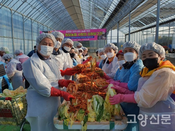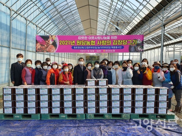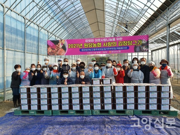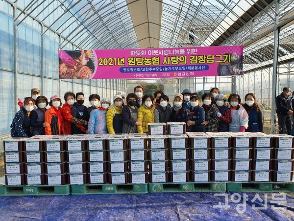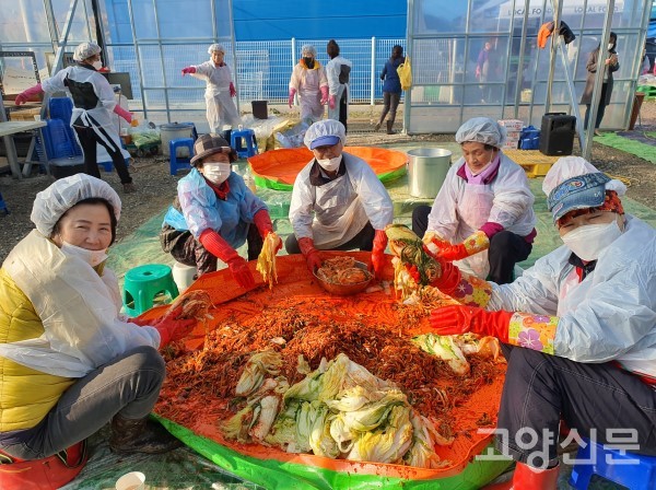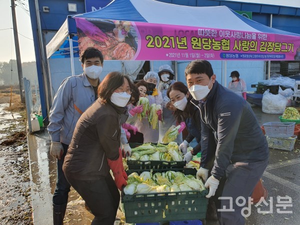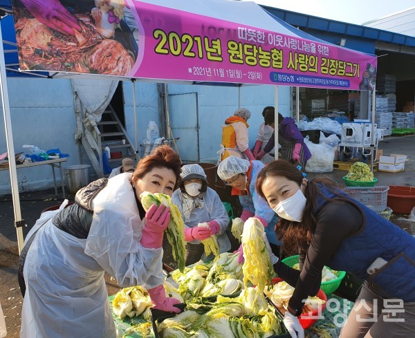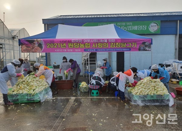 [고양신문] 원당농협(조합장 강효희)은 지난 1일부터 이틀 동안 직접 재배한 배추로 이웃들에게 전할 김장 행사를 진행했다. 행사에는 원로청년회(회장 장석영), 고향주모(회장 정명희), 농가주모(회장 조옥분), 채움봉사단(단장 이옥희), 이사, 감사, 이재준 시장의 부인 문미영 여사, 고양시농업기술센터 이도연 소장, 농협중앙회 고양시지부 현서동 단장 등이 함께했다.
