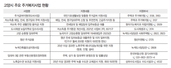 생계수급자 및 65세 이상 차상위계층 등을 대상으로 하는 영구임대주택의 경우 고양향동 등 공공주택단지 5곳에 총 3023세대가 공급되어 있으며 매년 공고를 통해 입주희망자들을 모집하고 있다. 임대료는 시중 시세의 30% 수준이며 2년마다 재계약을 통해 최장 50년까지 거주 가능하다. 기존 임대주택 지원사업 외에도 쪽방·비닐하우스·고시원 등에 거주하는 주거취약계층, 경제위기에 따른 위기가구를 위한 주거지원 사업도 별도로 마련돼 눈길을 끌고 있다.