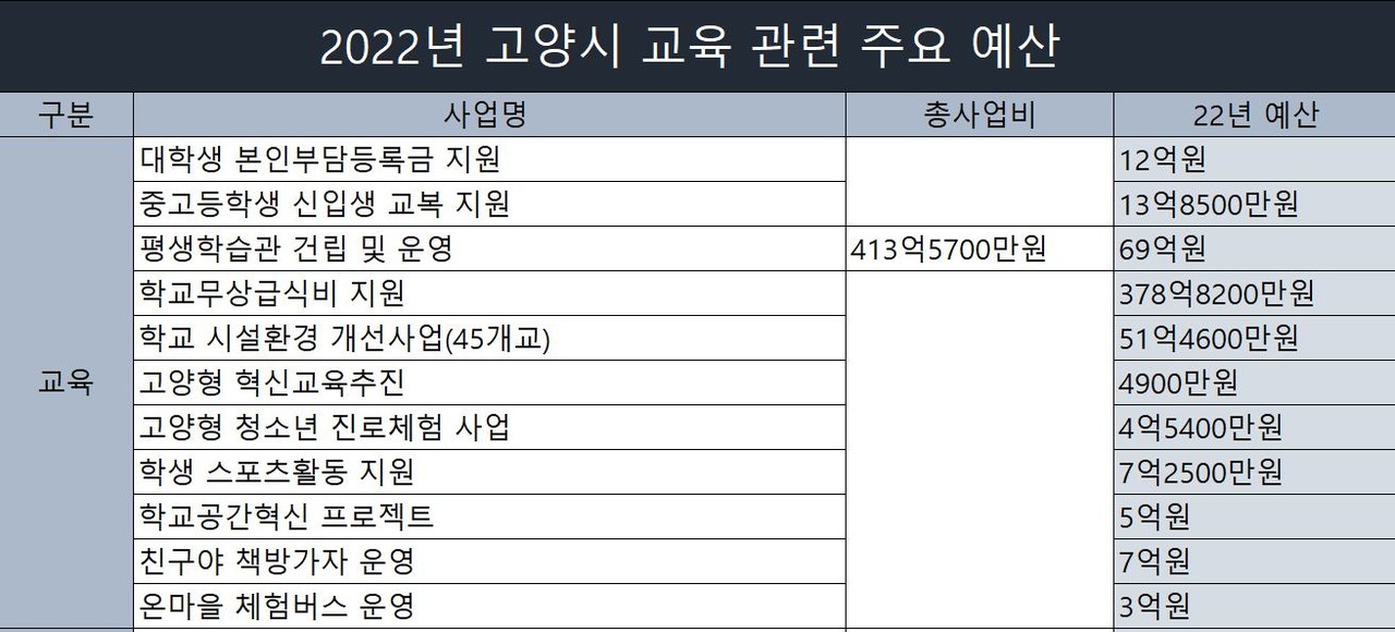 교육복지 보편화의 일환으로 고양의 모든 중고등학생 신입생들에게 교복구입비를 무상으로 지원하기 위해 13억8500만원이 책정됐다. 고양시 관계자는 “올해 고양시 중고등학생 신입생은 1만9996명이었는데 내년은 1만8477명으로 준다. 신인생 1인당 30만원 정도 지급되는데 필요한 총 예산은 55억4300만원이다. 이 금액 중 시비로 25%가 들어가고 나머지는 교육청과 도비로 충당 된다”고 설명했다.
