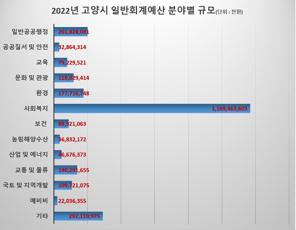 증감액수가 가장 늘어난 분야는 역시 1352억원 증가한 사회복지예산이다. 올해 고양시 주요 사회복지예산으로는 출산지원금 지원, 일자리기금 전출금, 출산가구 전월세자금 지원 등이다. 그 다음으로는 690억원 증가한 일반공공행정예산으로 신청사 건립기금 전출금, 효자동 청사건립, 제8회 전국동시지방선거 지원 예산 등이 포함된다.