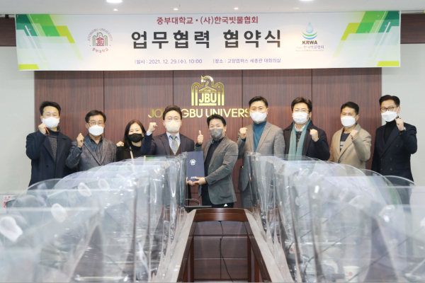 [고양신문] 중부대학교(총장 권대봉)가 29일 고양캠퍼스 대회의실에서 (사)한국빗물협회와 업무협력 협약을 체결했다. 협약식은 중부대학교 대외협력처 하성용 처장, 박은영 정원문화산업학과 학과장과 한국빗물협회 최경영 회장 김신 부회장, 박성수 사무국장, 채일권 이사뿐 아니라 조영원 일도엔지니어링 대표도 참석한 가운데 진행됐다.
