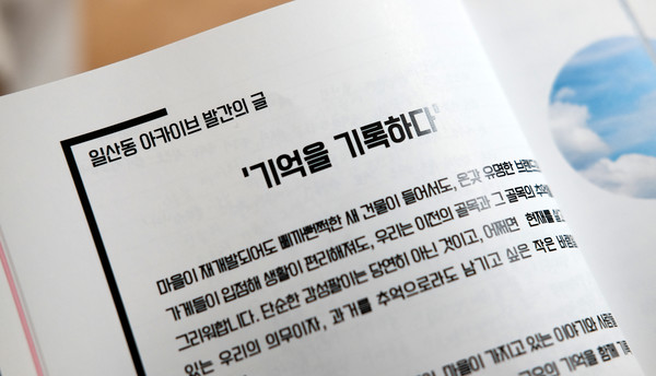 ‘마을을 보는 우리의 눈, 마을을 담은 우리의 마음’이라는 슬로건으로 시대의 기록을 담은 일산동 아카이브가 책으로 발간됐다. 가로 14.8㎝, 세로 21㎝, 두께 0.7㎝, 총 120쪽. 한 손에 잡고, 두 손으로 펴기에 부담 없는 크기다. 흰색 표지에 세로로 두 줄 『일산동 아카이브』라고 큼지막하게 인쇄된 표지는 무슨 내용이 있는지 궁금증을 자아낸다.