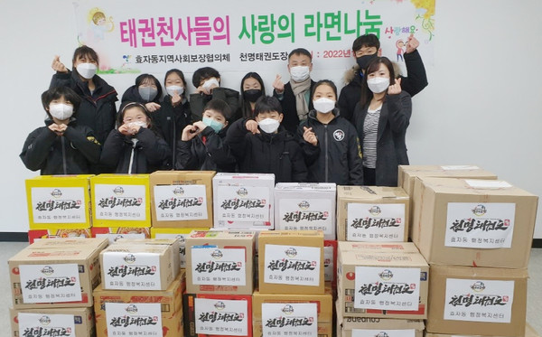 효자동 천명태권도&줄넘기클럽(관장 안재중)이 지난 13일, 작년에 이어 올해도 원생들이 십시일반 마음을 모아 마련한 라면 1,069개를 효자동 지역사회보장협의체에 기탁했다.