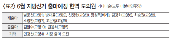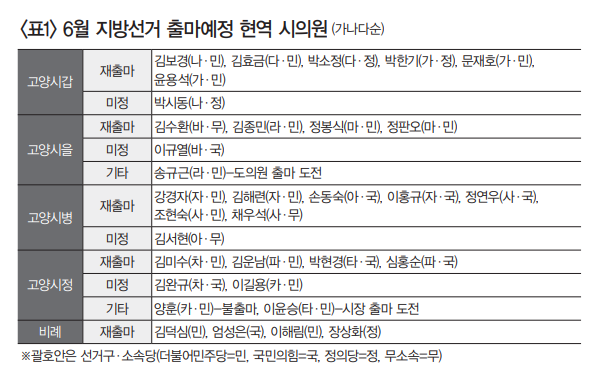 고양신문은 2022년 새해를 맞아 6월 지방선거를 준비하는 현역의원들의 출마현황을 파악해봤다. 대선을 목전에 두고 다들 조심스러운 분위기였지만 대다수 의원들은 재출마를 희망했다. 몇몇 의원들은 체급을 높여 출마하는 방향을 고심했으며 일찌감치 불출마 의사를 밝히거나 대선 이후로 거취표명을 미루는 의원들도 있었다.