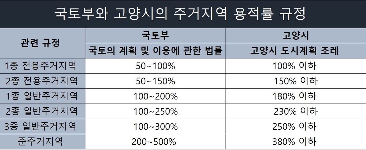 고양시 도시계획 담당자는 “주거지역에서 500% 용적률을 상향시키기 위해서는 우선 정부법령 개정이 이뤄져야 하고 이후 조례 개정이 뒷받침되어야 한다. 정부법령이 포괄적으로만 용적률을 규정하고 구체적 규정은 각 지자체에 위임하는 이유는 각 도시 특성을 고려하기 때문이다. 정부법령이 개정된다 하더라도 고양시는 아직까지 고밀도로 개발할 필요성을 느끼지 못하기 때문에 조례개정이 이뤄질지는 미지수다”라고 말했다.