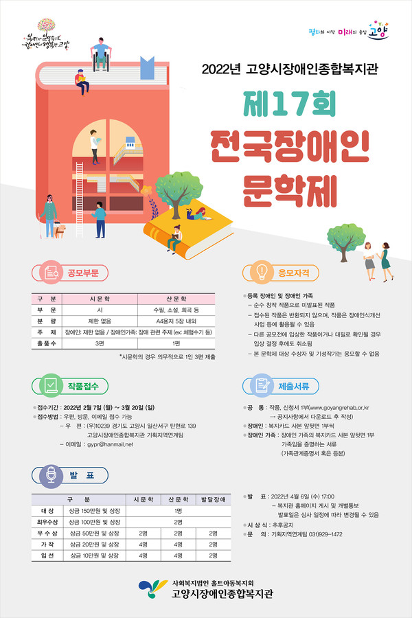 고양시장애인종합복지관이 2022년 제17회 전국장애인문학제 출품작을 2월 7일(월)부터 3월 20일(일)까지 접수한다. 전국장애인문학제는 전국 등록 장애인과 장애인 가족의 순수 창작 작품을 대상으로 시문학과 산문학으로 나누어 진행되며 장애 당사자는 작품 주제에 제한 없이 출품이 가능하다. 반면 장애인 가족 참가자는 ‘장애’를 주제로 한 작품만 출품이 가능하다.